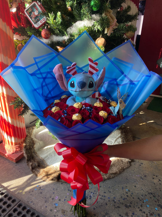 24 roses + stitch plush + blue babysbreath 💙