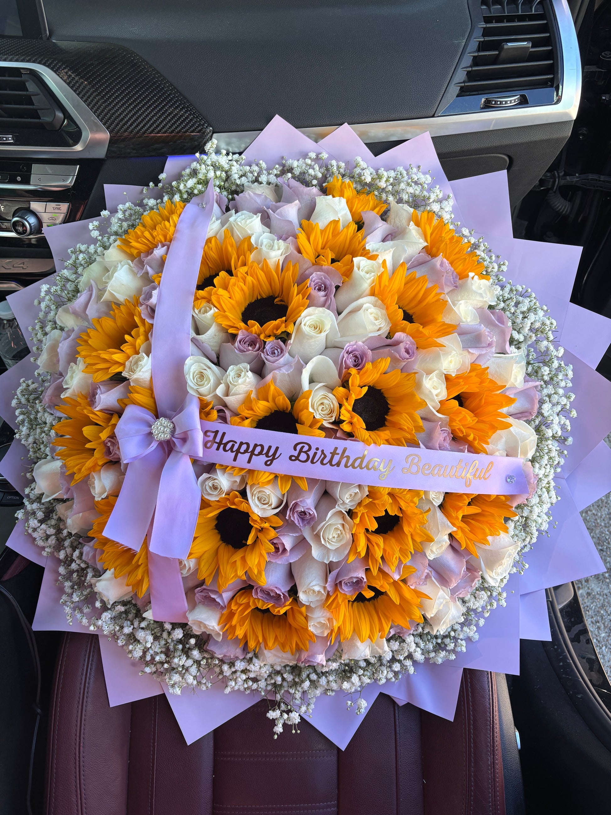 50 White Ecuadorian roses + 50 lavender roses + 18 sunflowers and a babysbreath rim