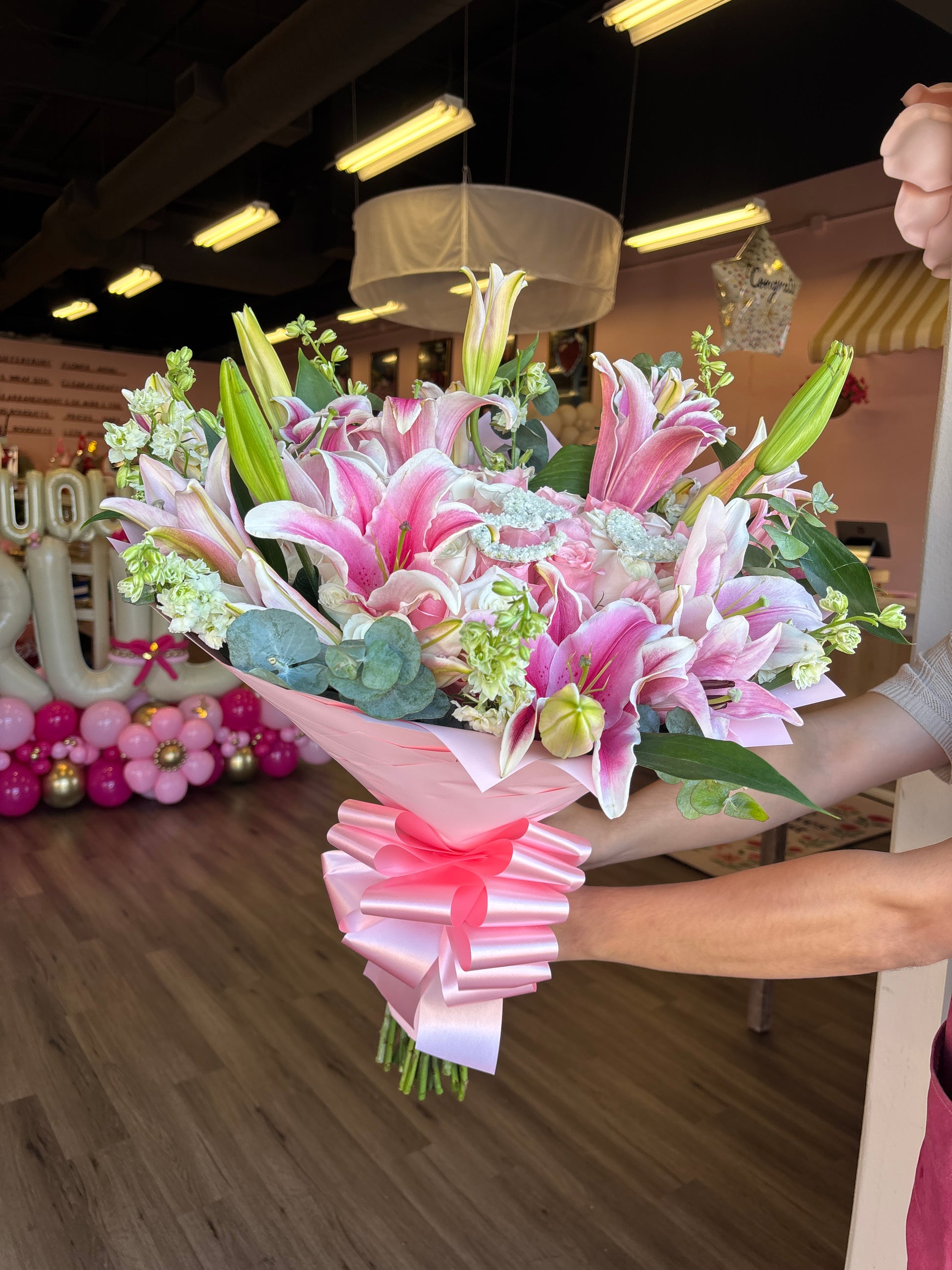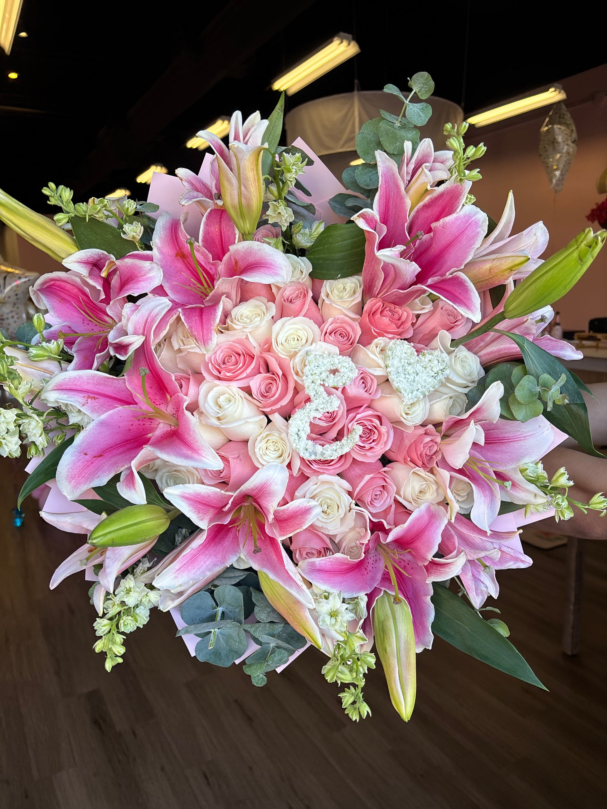 + 5 opened lilies on top of the roses