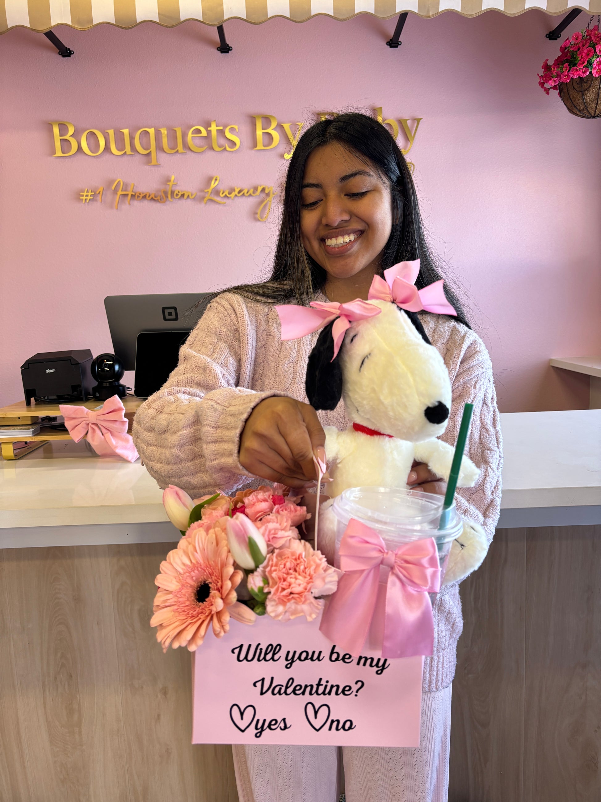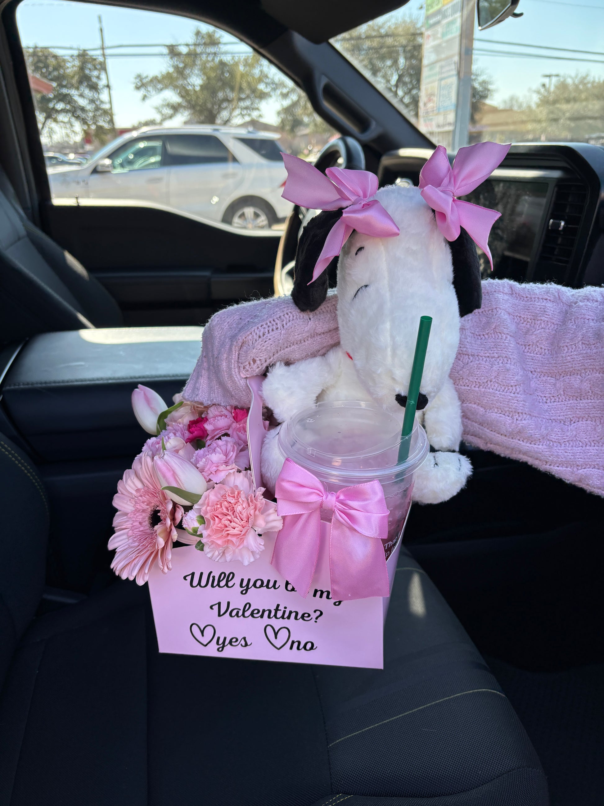 This cupholder arrangement includes a mix of pink flowers on one side of the cupholder. These are freestyle chosen flowers, but in pink colors, choose the favorite plushy that she would love