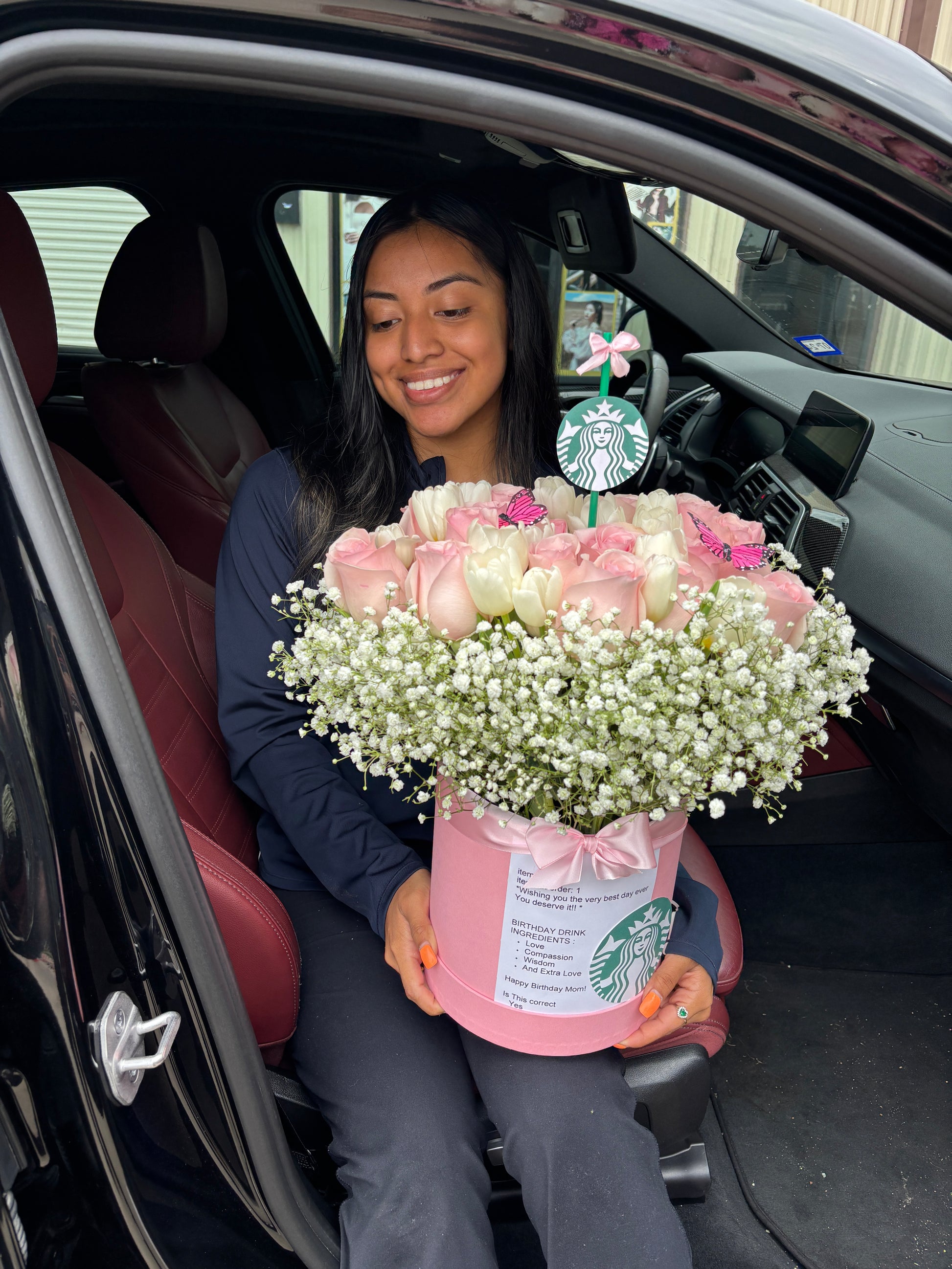 -10-20 tulips on top of the box with touch of babysbreath (yes it has sponge underneath for the flowers to drink water) plus roses