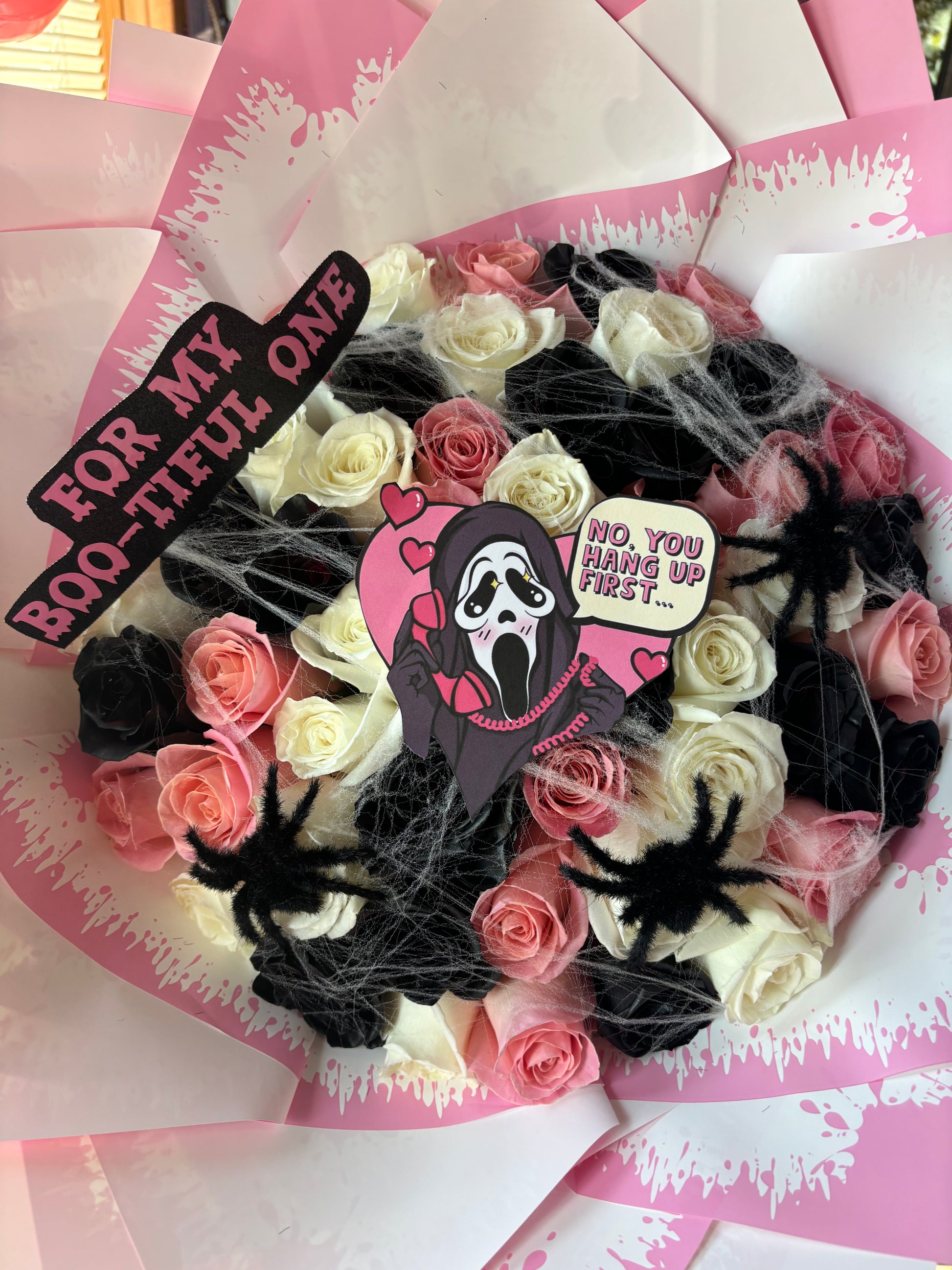 -2 toppers one with glitter stated “For my boo-tiful one” and the ghostface topper no you hang up💞🔪