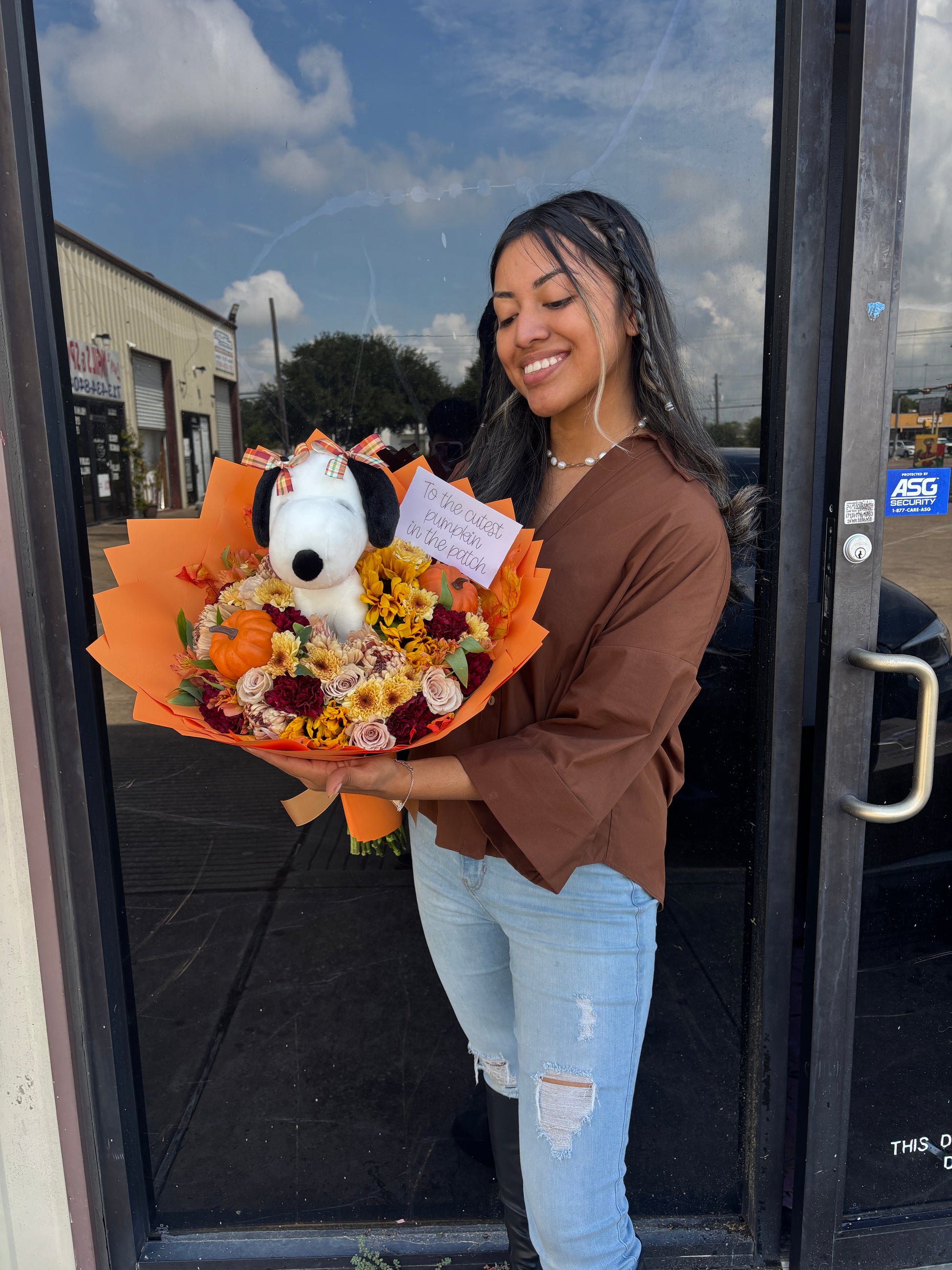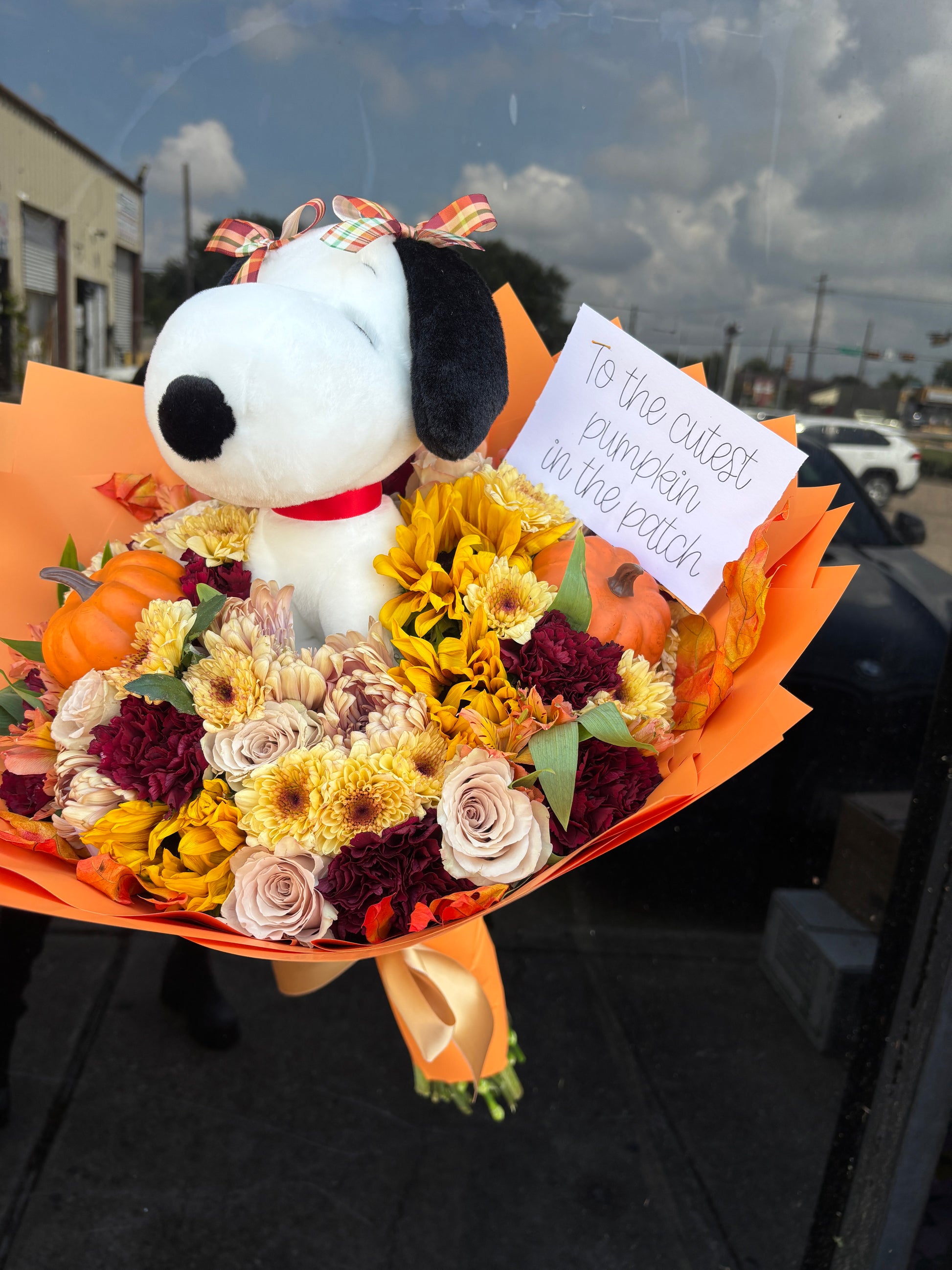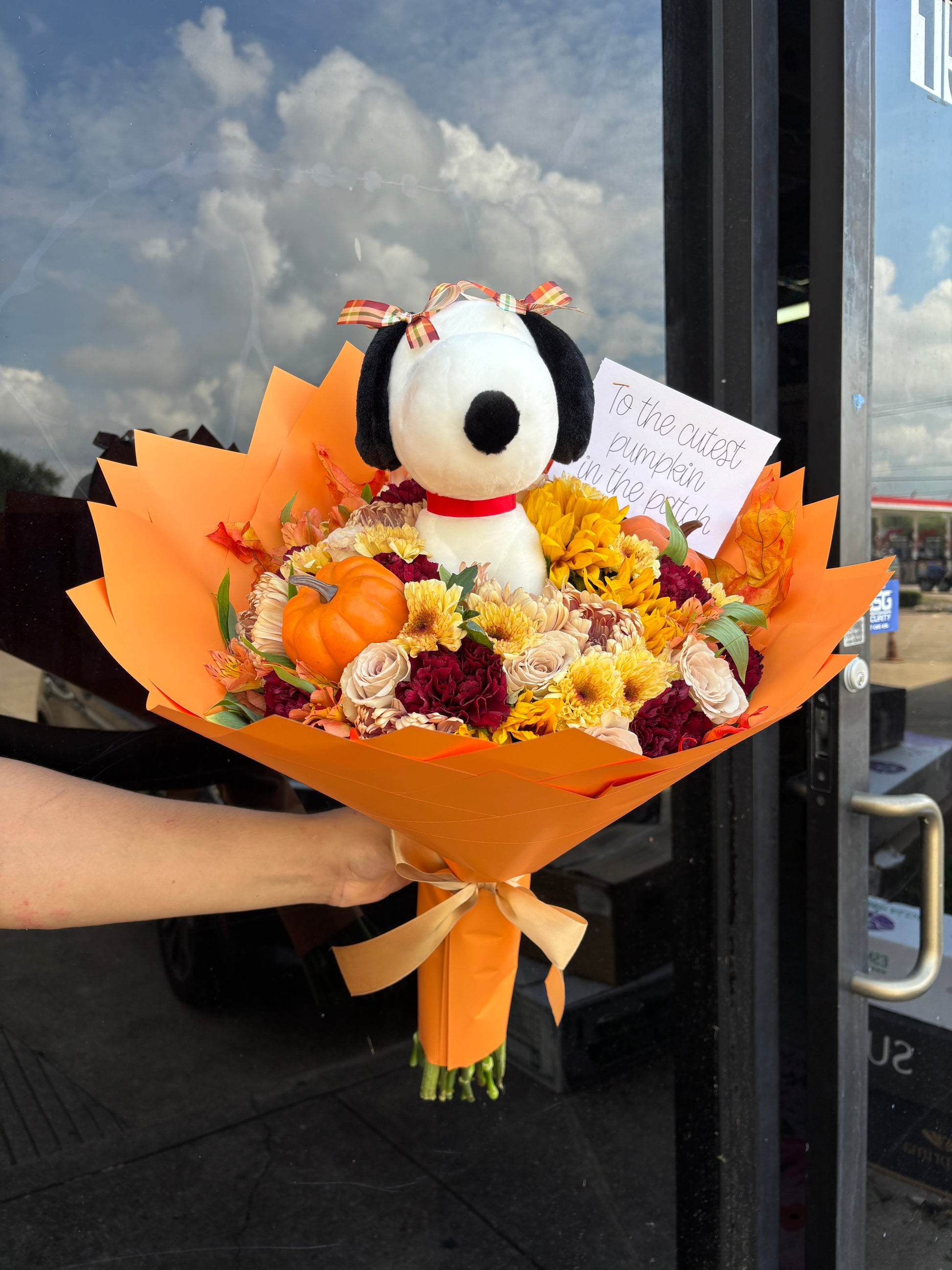 A beautiful mix of fall colors with snoopy plushy in the middle with 2 fall theme fabric pattern bows and 2 Pumpkins , along with leaves touch and a light brown bow with a note