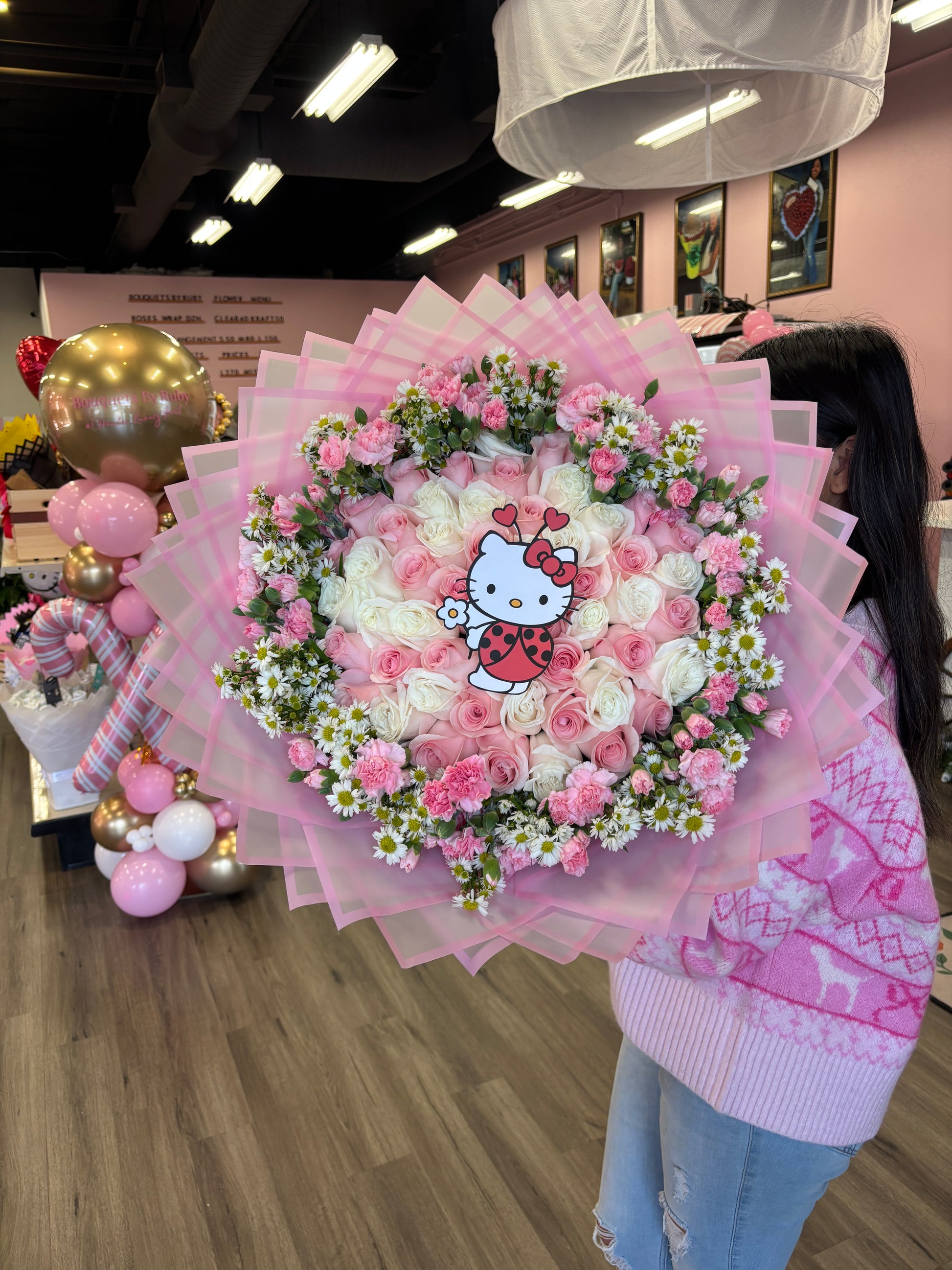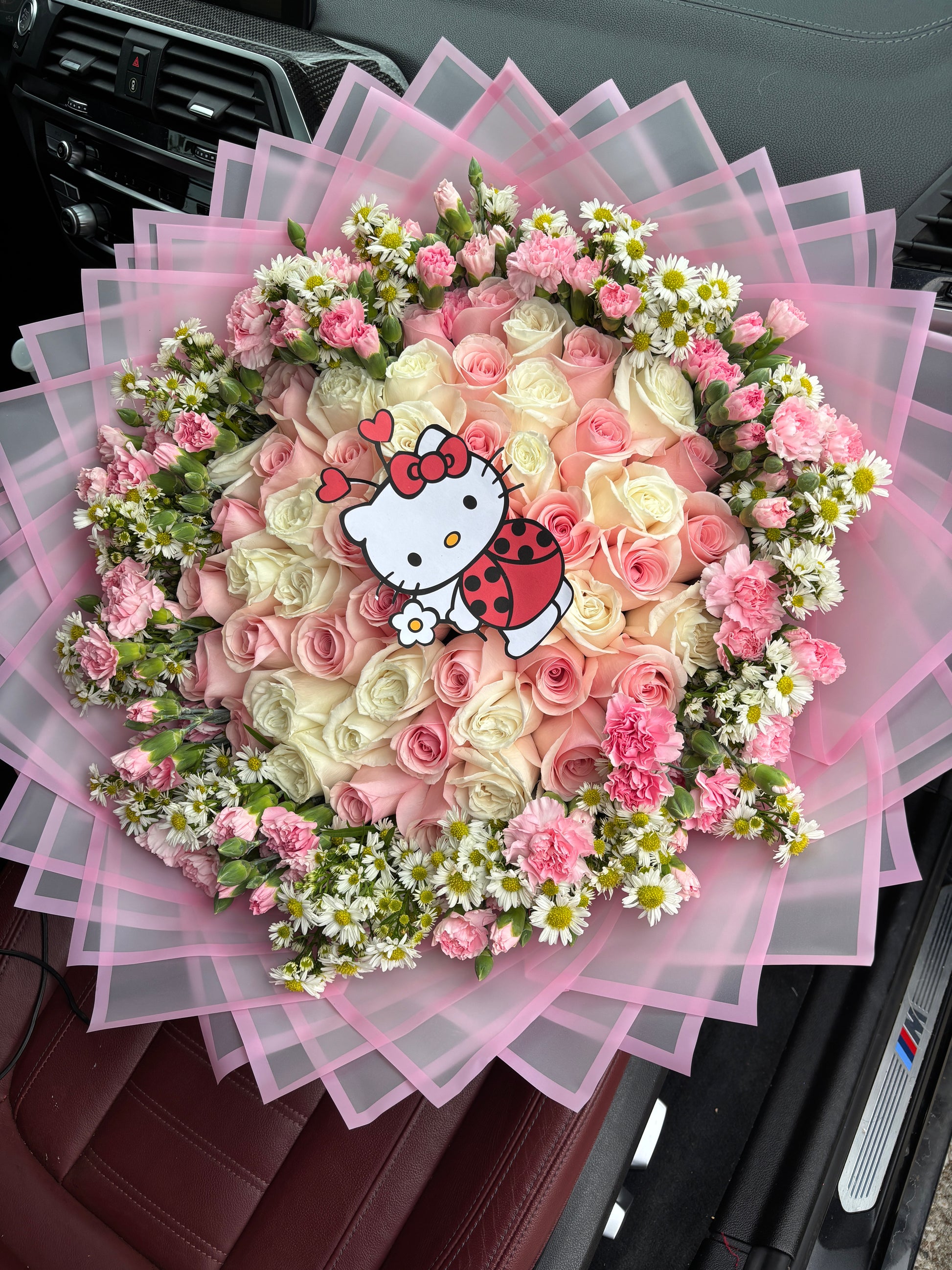 25 Pink Ecuadorian roses and 25 White Ecuadorian roses with a rim of pink Mini carnations and A fever few like flower around ๐ธย