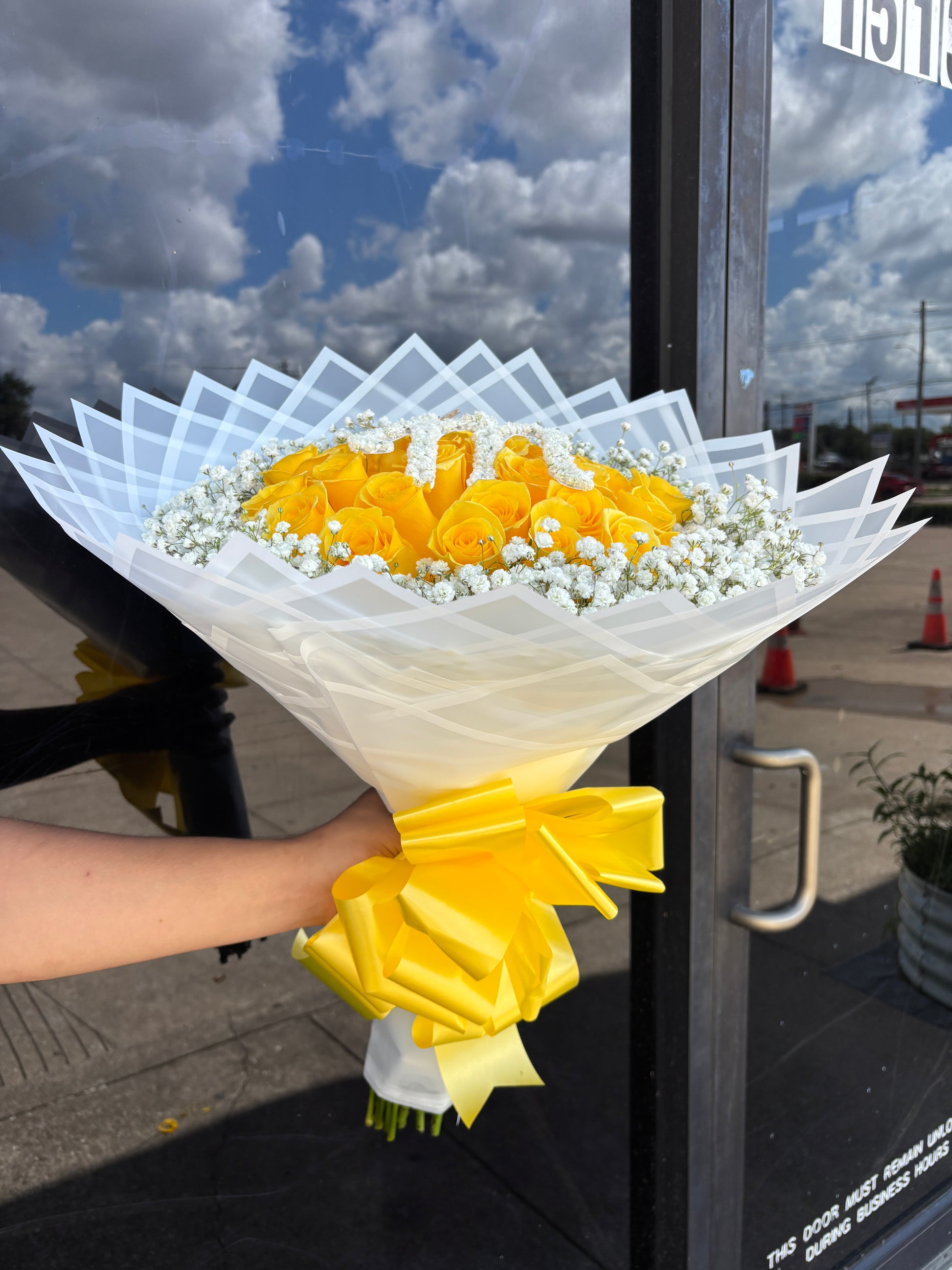 24 yellow roses with a babysbreath rim and a initial in the middle and a touch of gold butterfly, perfect if her fav color is yellow and choose her initial (below type) topped off with a pink bow